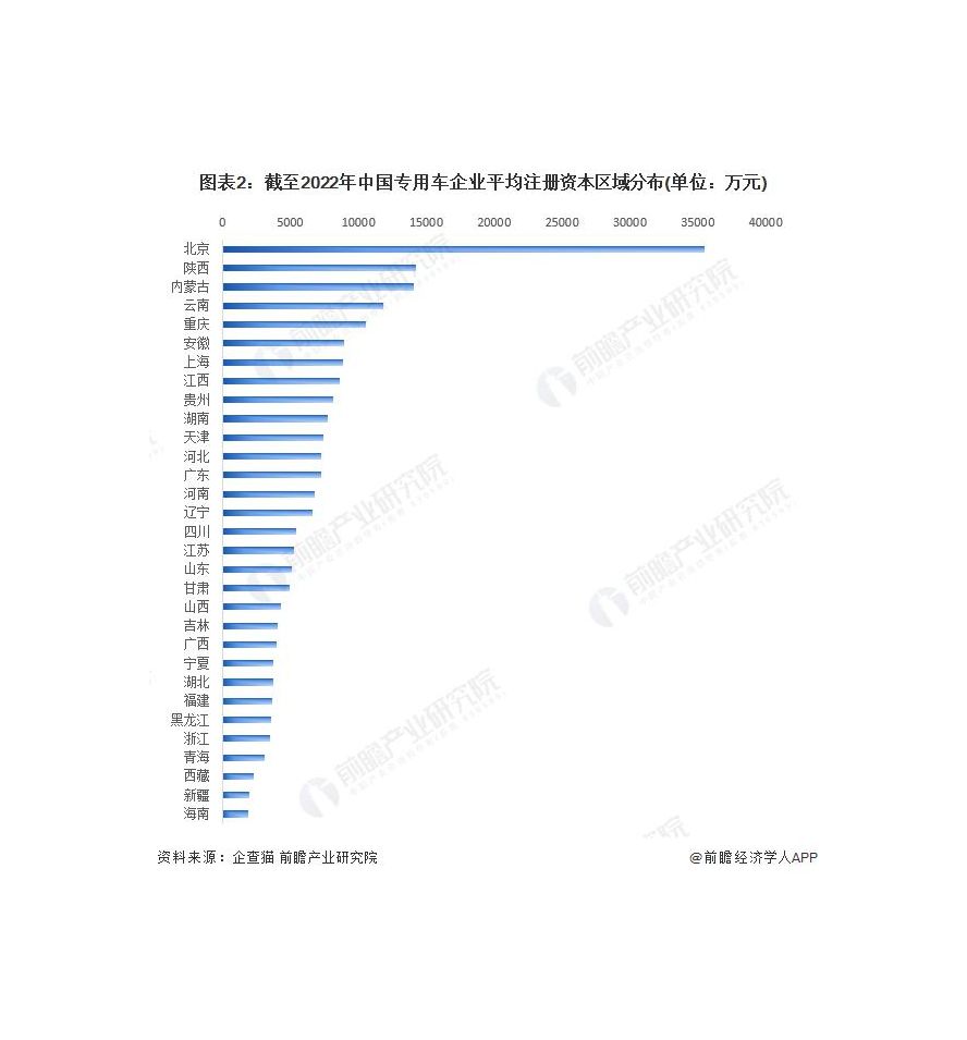 根據(jù)中國企業(yè)數(shù)據(jù)庫企查貓,目前中國專用車企業(yè)的平均注冊資本區(qū)域分布中,北京企業(yè)的平均注冊資本最高,達到 35468 萬元。
